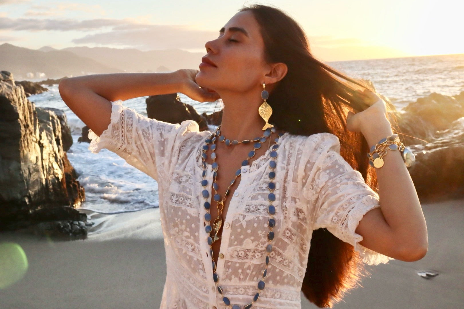 Inspired by seaside villages and ocean life, the Azure Fish Charm Earrings feature ocean blue opal stones and whimsical fish charms.