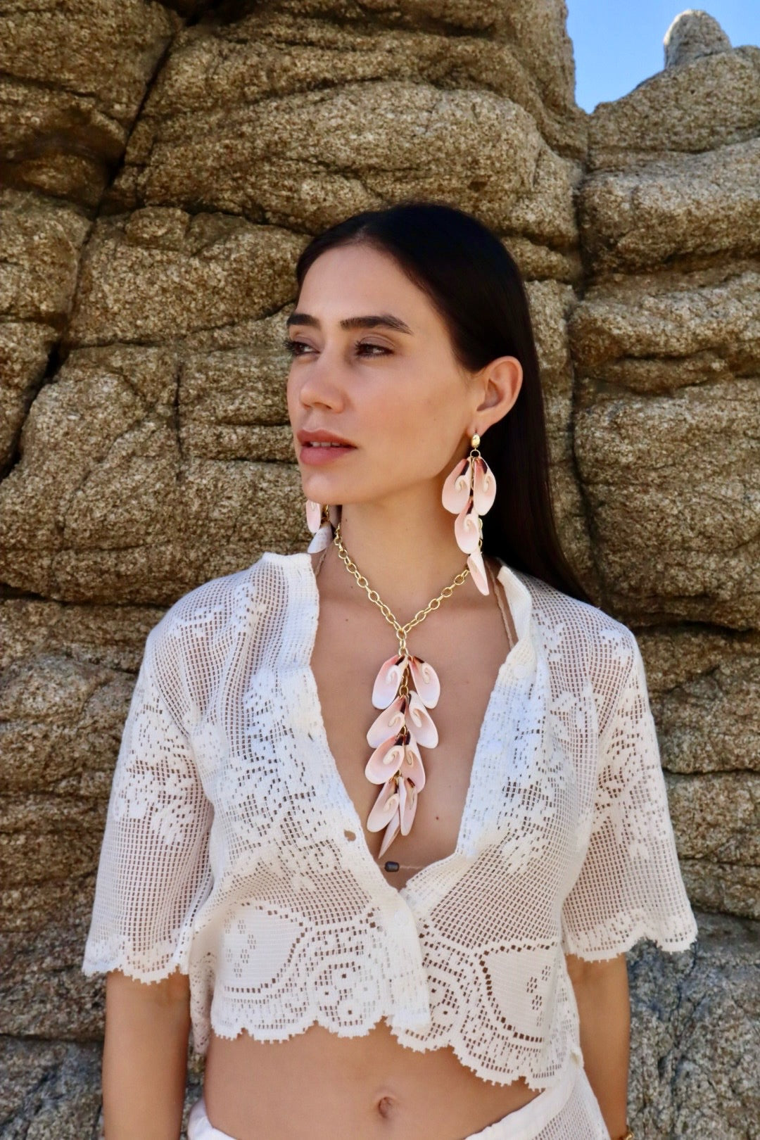 The Rosalina Shell Earrings feature blush shells arranged in a flowing cascade.