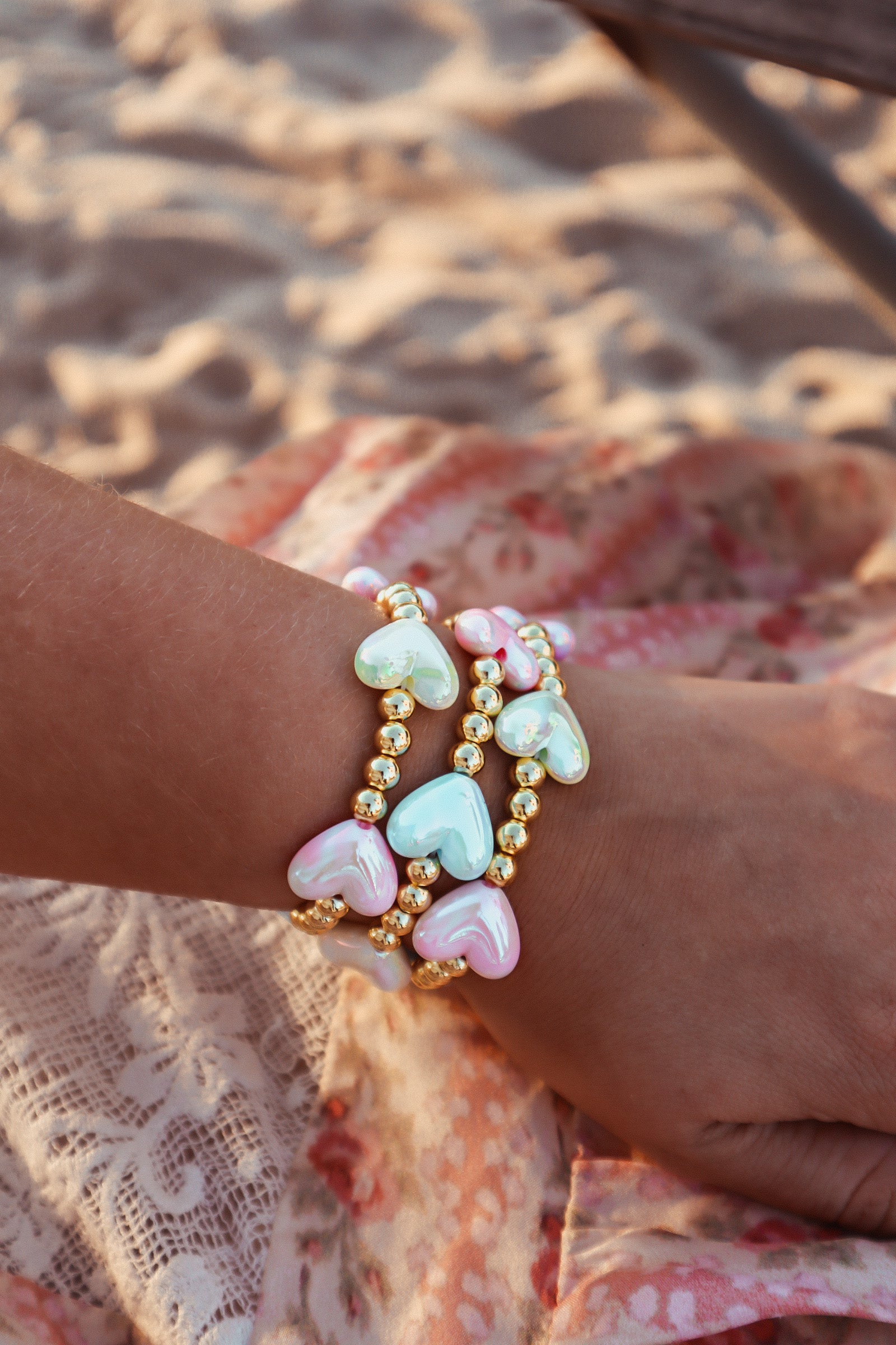 Talk about arm candy! The Amor bracelet features 5 large multi colored hearts around 6mm 18k gold filled beads. Looks stunning solo or layered.