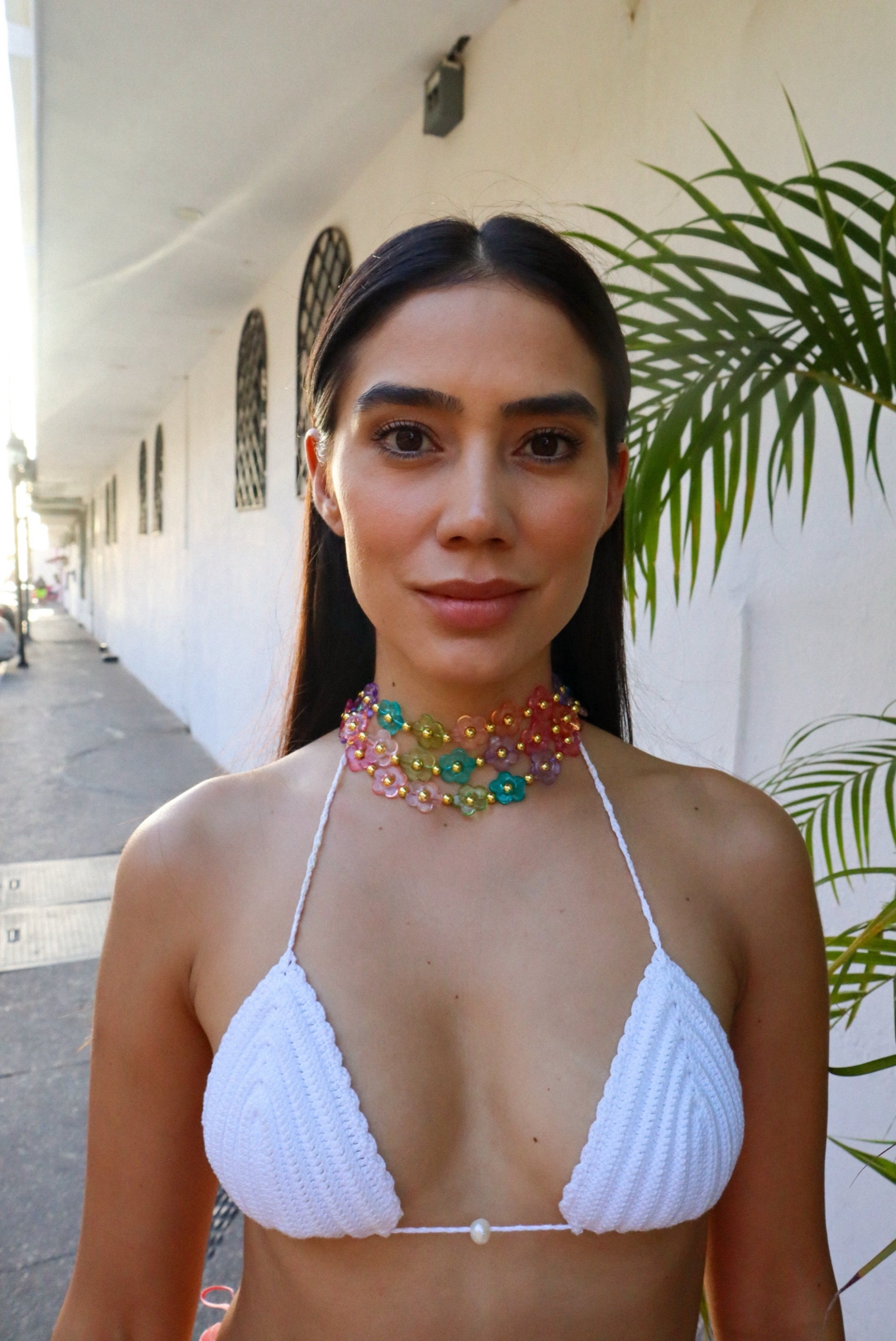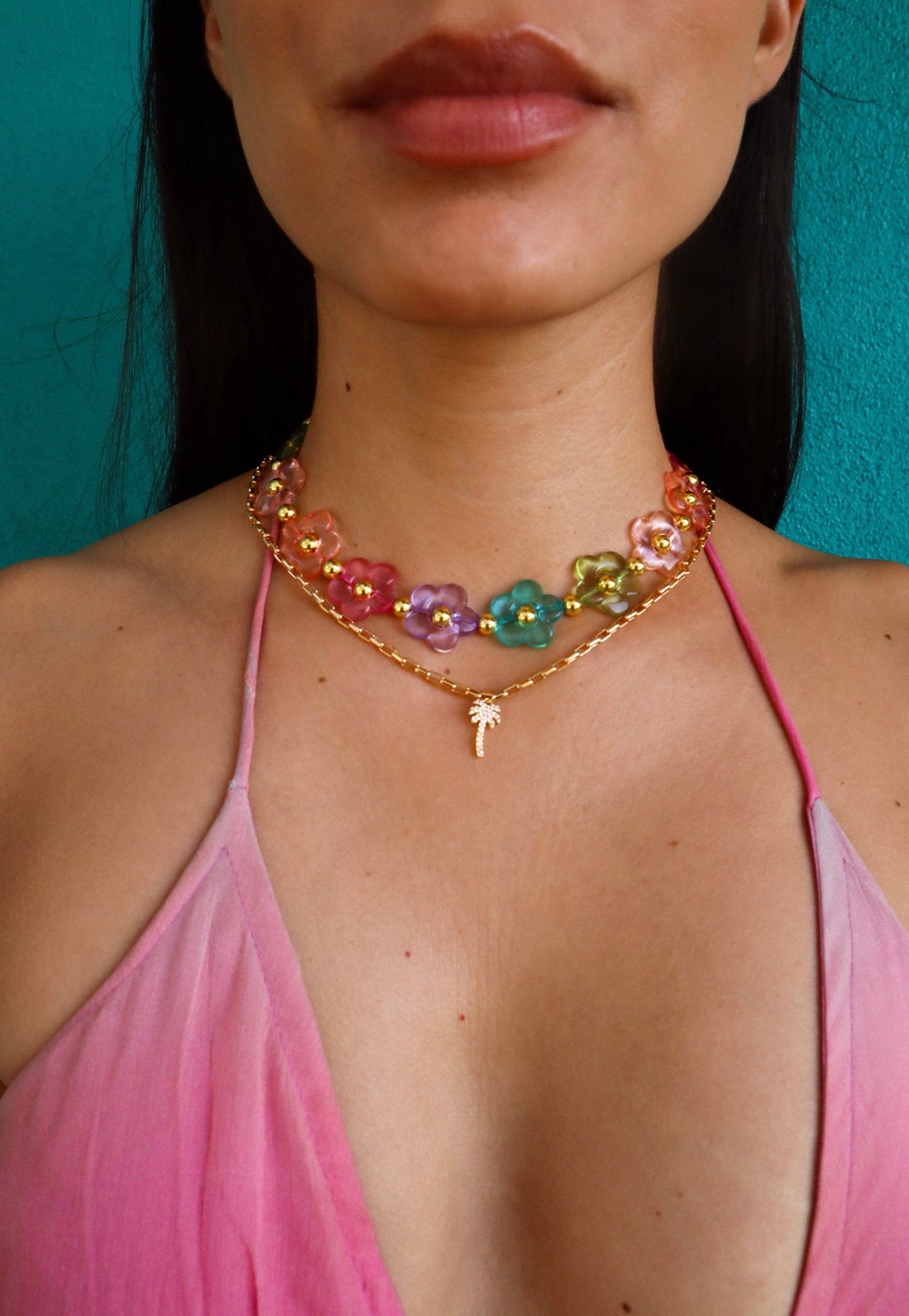 Add color and fun to any look with the Bonita necklace. This style features 6mm 18k gold filled beads with multi colored flower charms.
