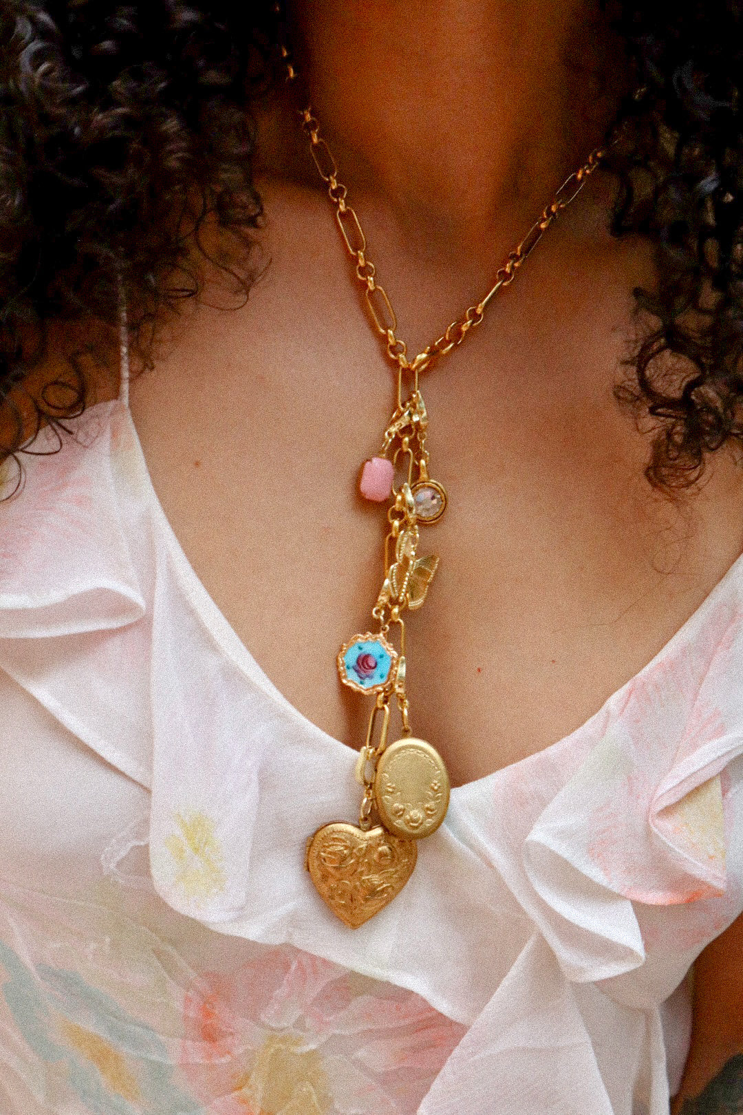 Create a one-of-a-kind treasure that’s perfectly you, adorned with vintage trinkets, natural shells, zodiac charms, and a statement centerpiece. Each charm is designed with a clip-on clasp, so you can rearrange, swap, and restyle them anytime for a fresh new look. One necklace, endless moods. This option is for a 14k antique gold plated chain.