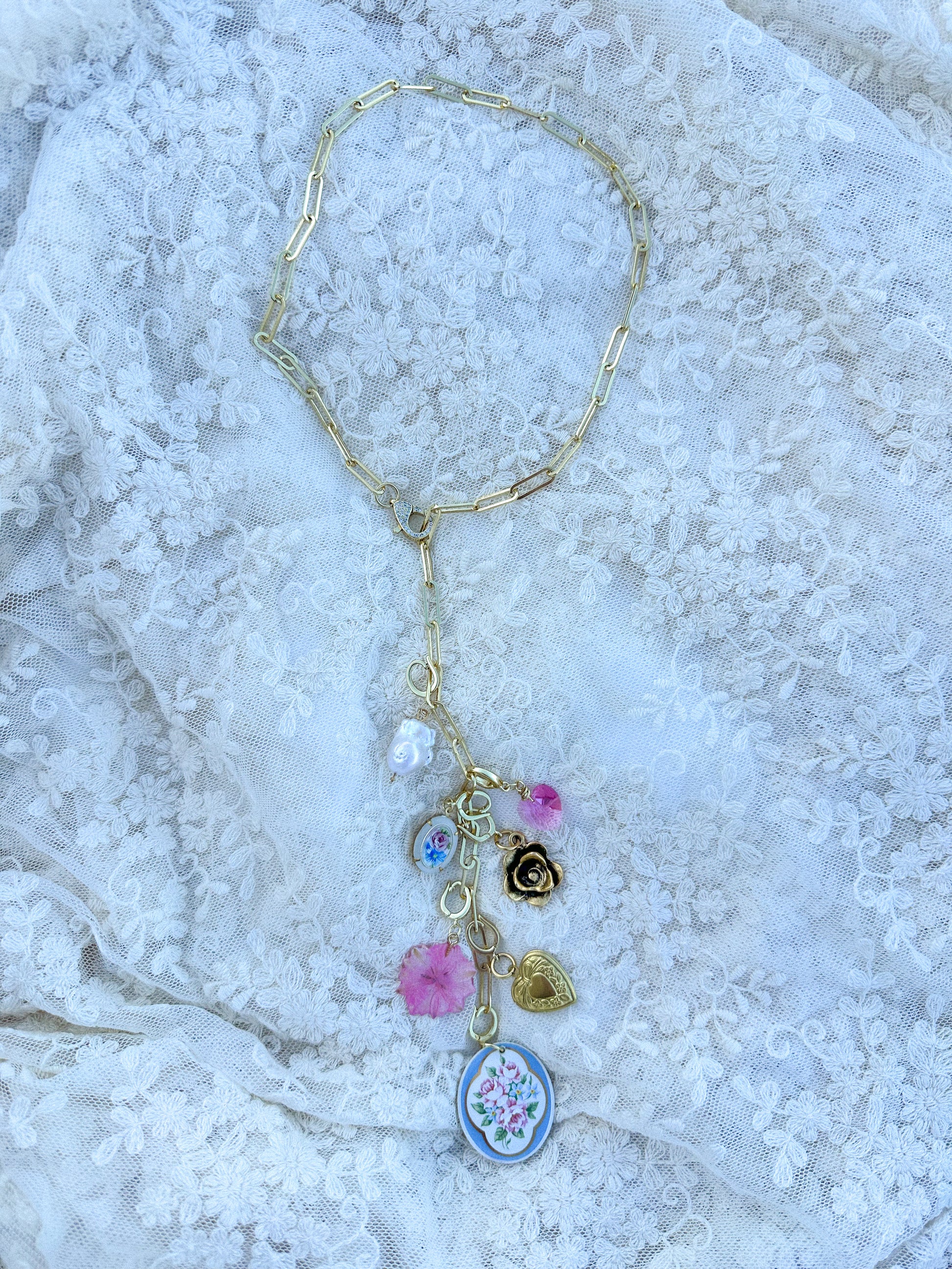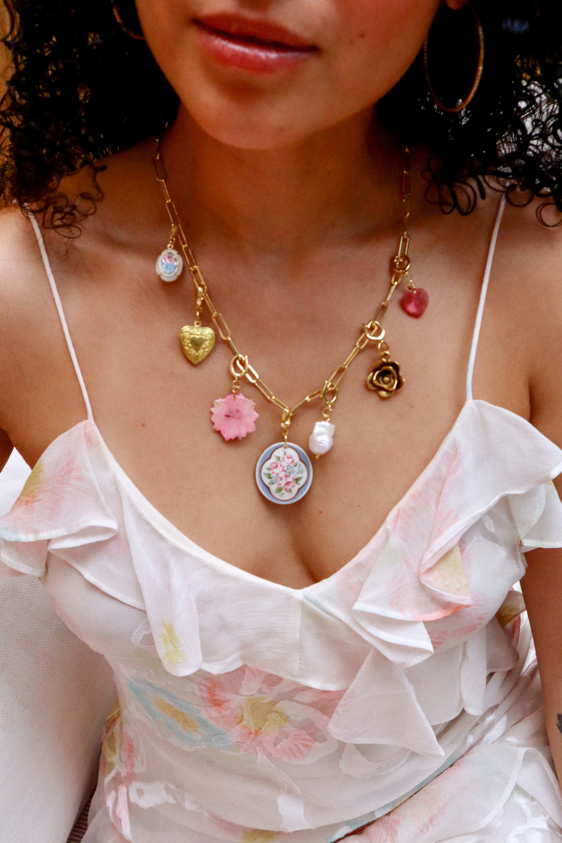 Create a one-of-a-kind treasure that’s perfectly you, adorned with vintage trinkets, natural shells, zodiac charms, and a statement centerpiece. Each charm is designed with a clip-on clasp, so you can rearrange, swap, and restyle them anytime for a fresh new look. One necklace, endless moods. This option is for an 18k gold filled chain.