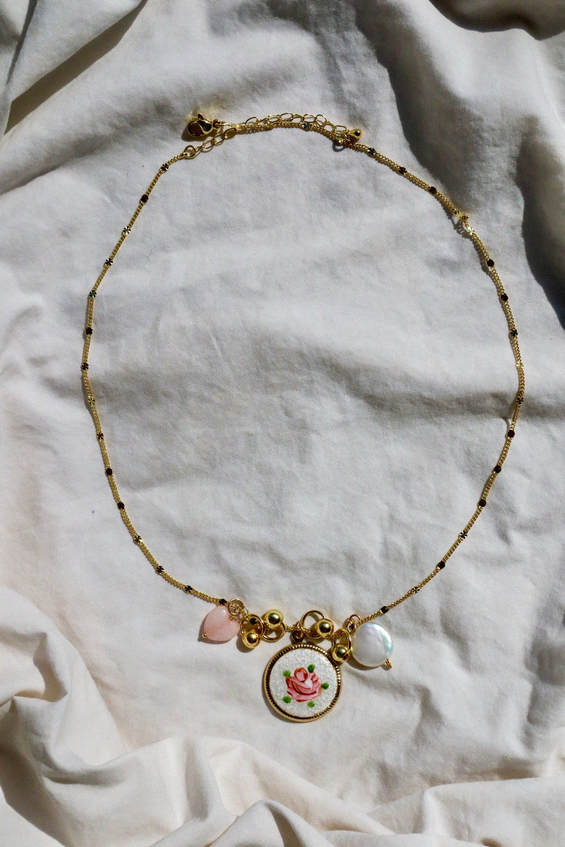 A whisper of romance, a touch of vintage charm—The Etherel Bloom Charm Necklace is a dainty dream spun from golden light. Suspended from a delicate, shimmering gold filled chain, a hand-painted pink flower pendant blooms like a love letter from the past, each brushstroke a story of timeless elegance.