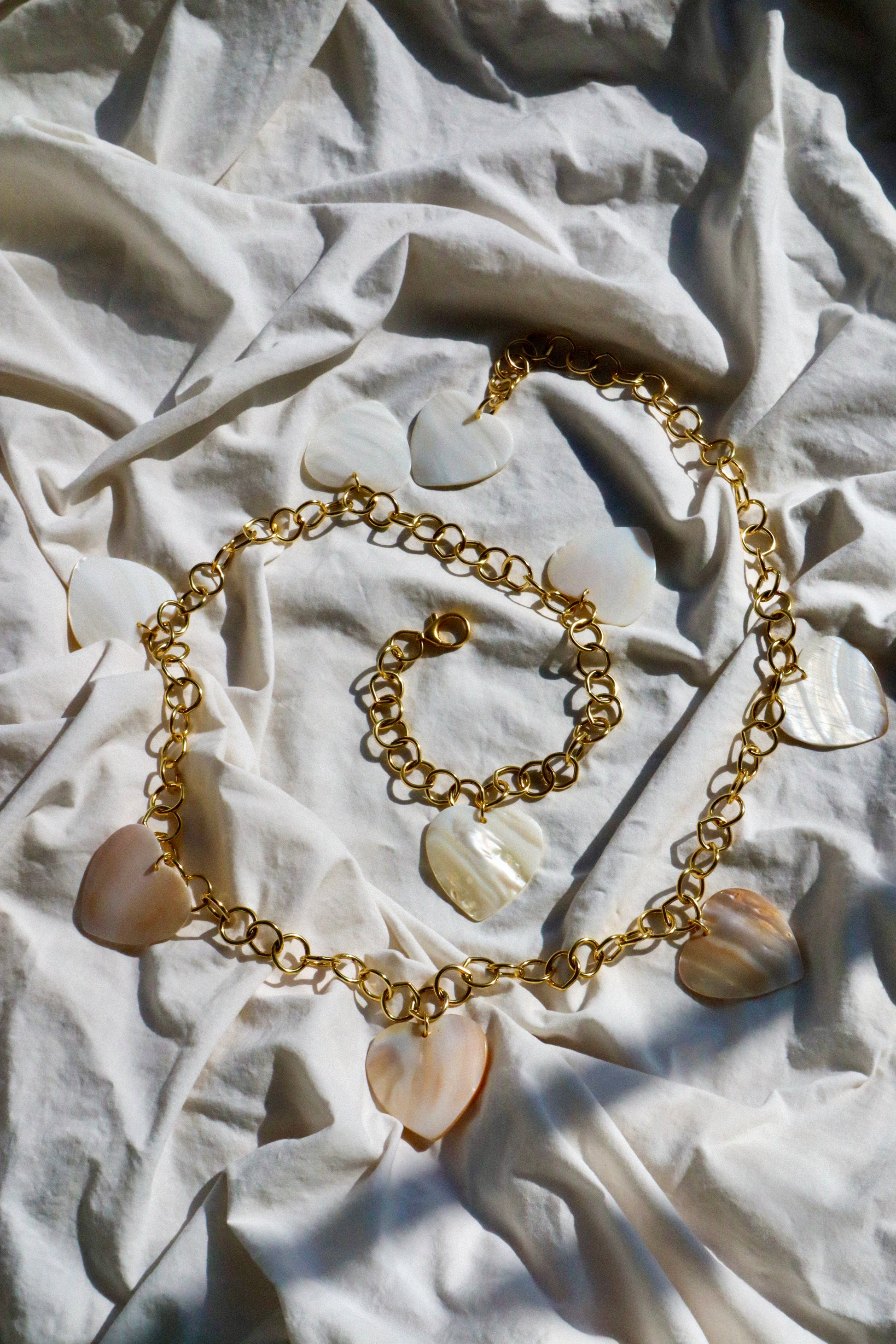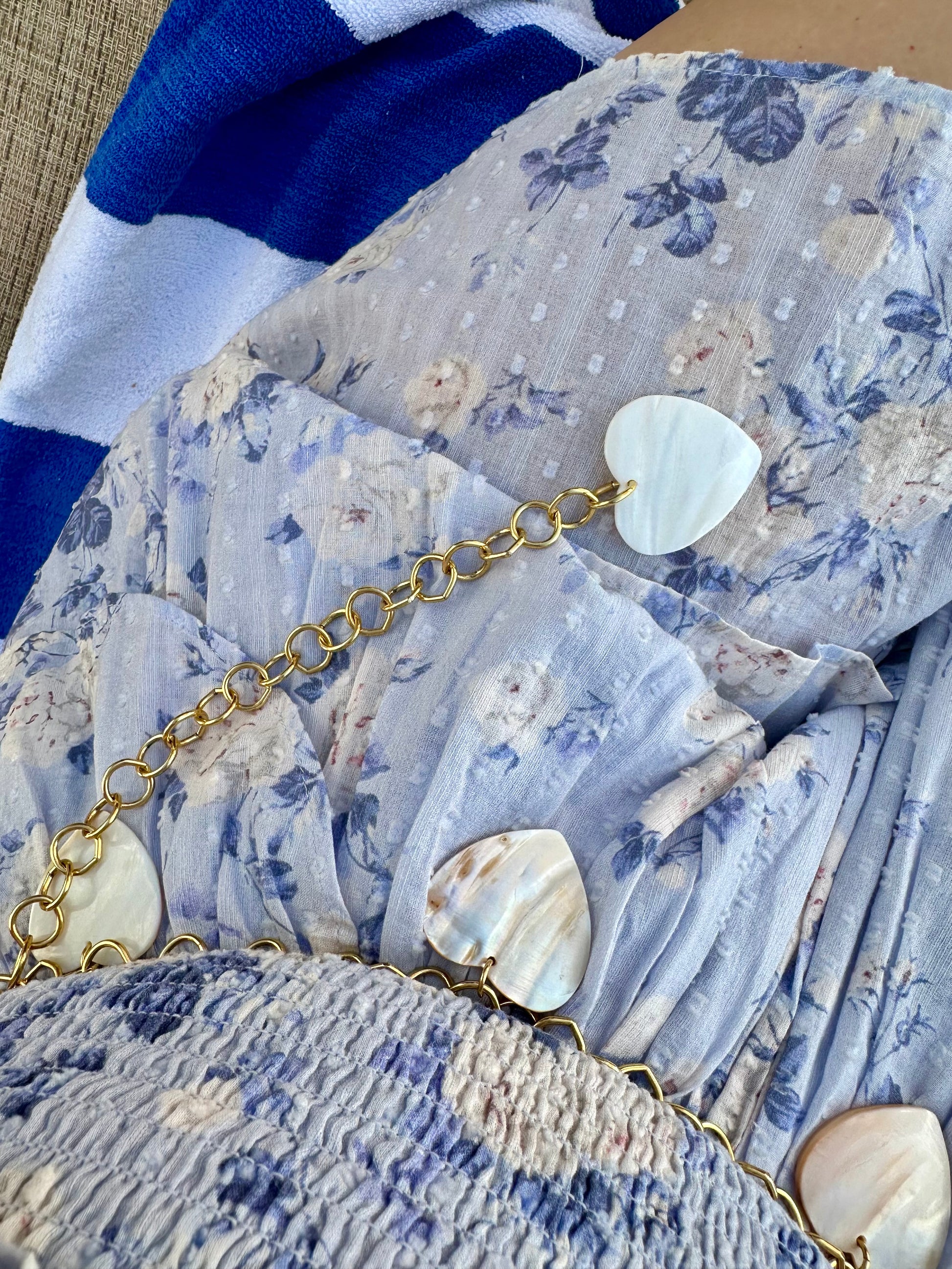 Adorning the chain are large, luminous natural shell heart shaped pendants, with a soft iridescence that catches the light with every step. This belt is not just an accessory; it’s a work of art that transforms any outfit, adding a sense of romance and whimsy to your look.