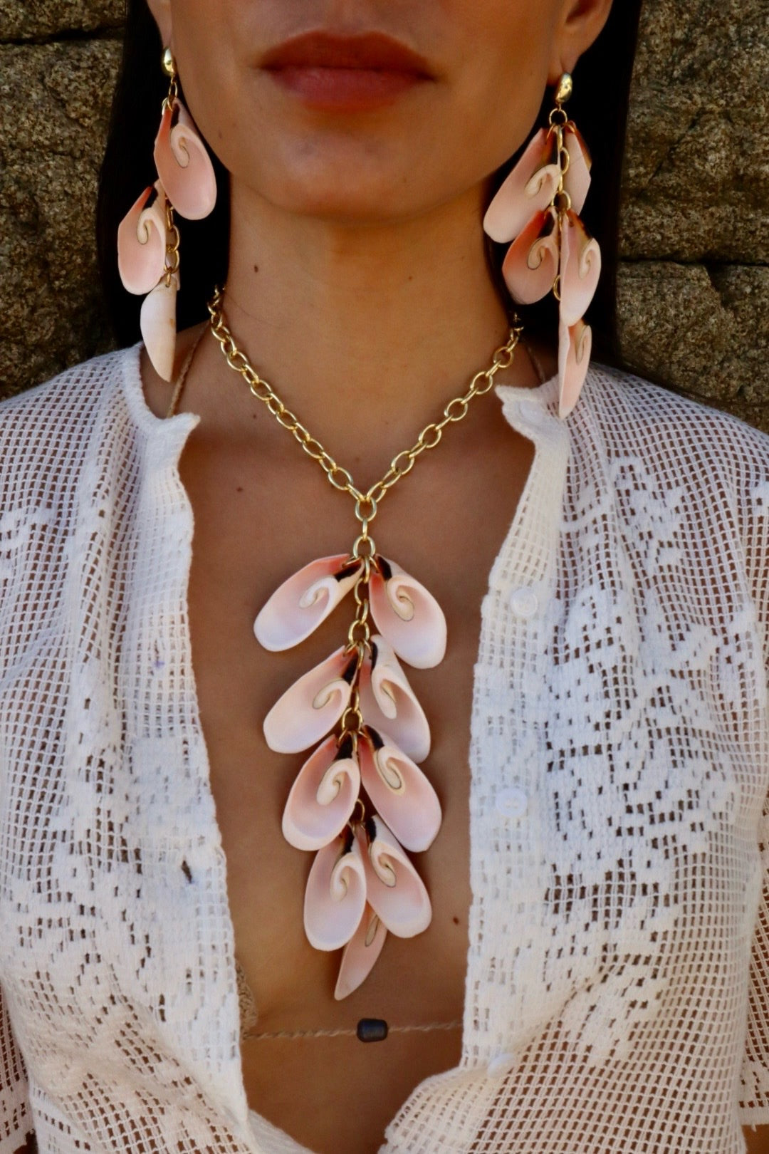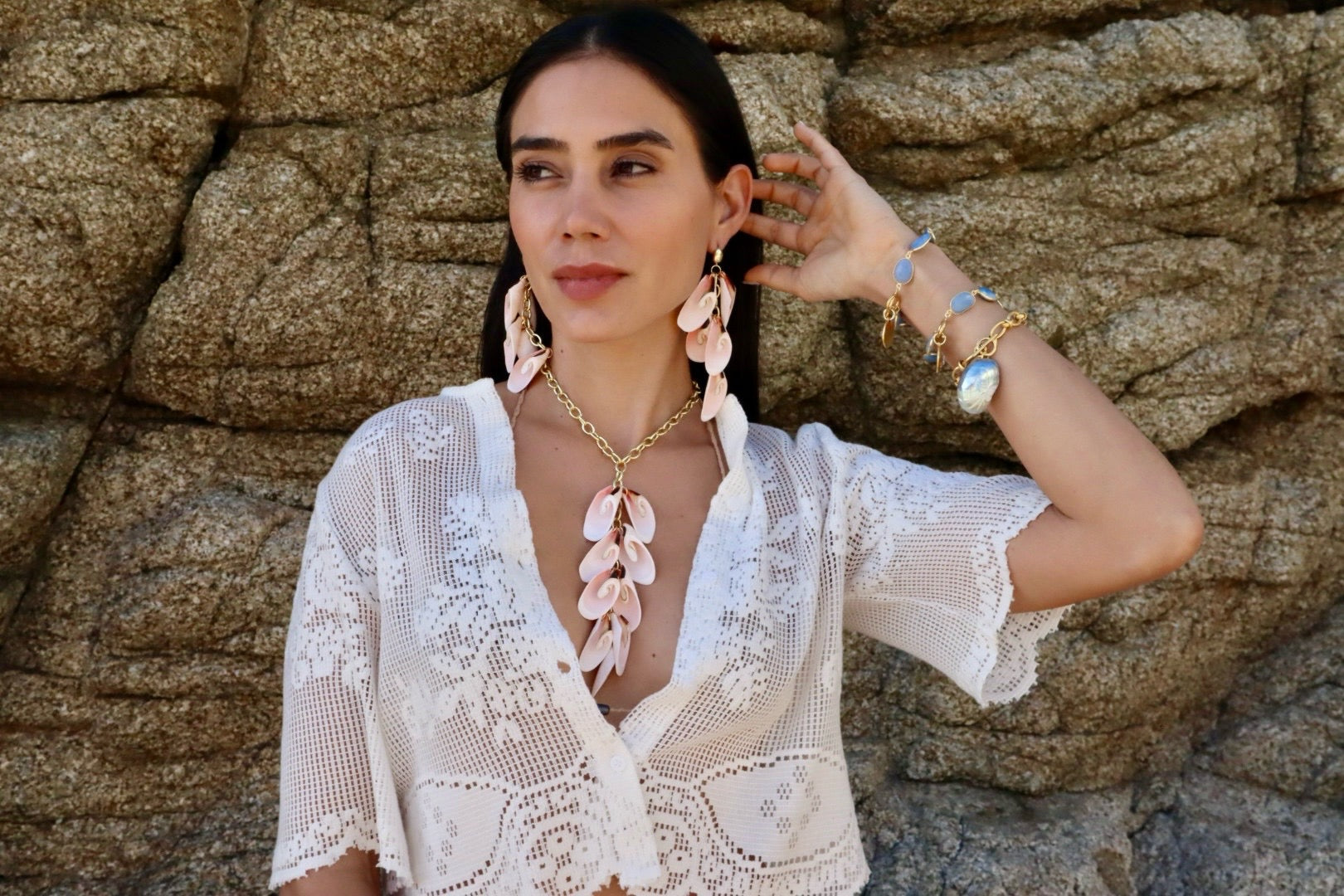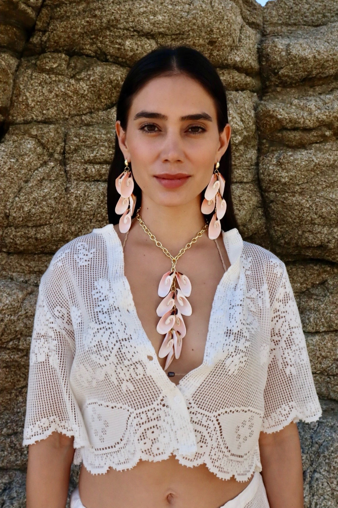 The Rosalina Shell Necklace features blush shells arranged in a flowing cascade.