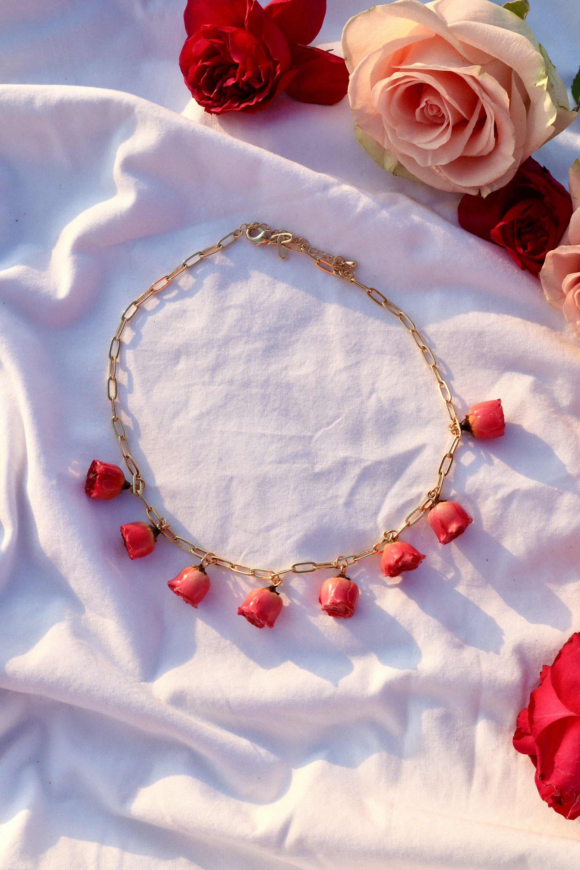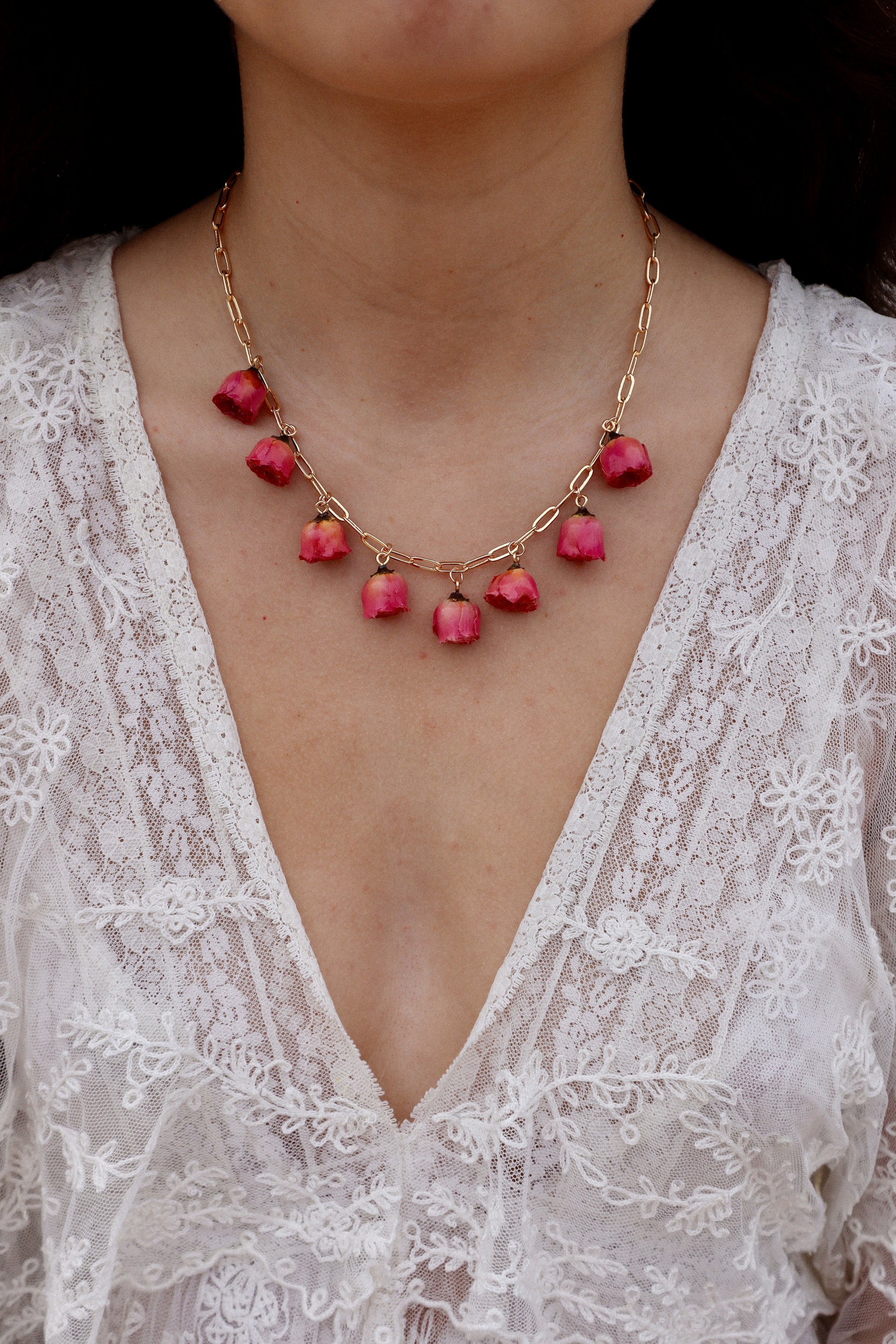 A delicate cascade of pink roses. This necklace feels like you're wearing a secret garden around your neck.