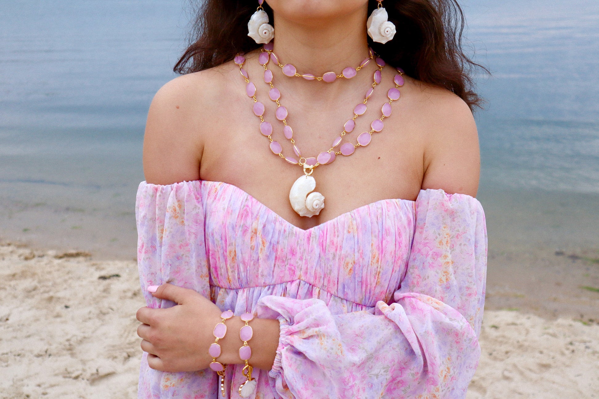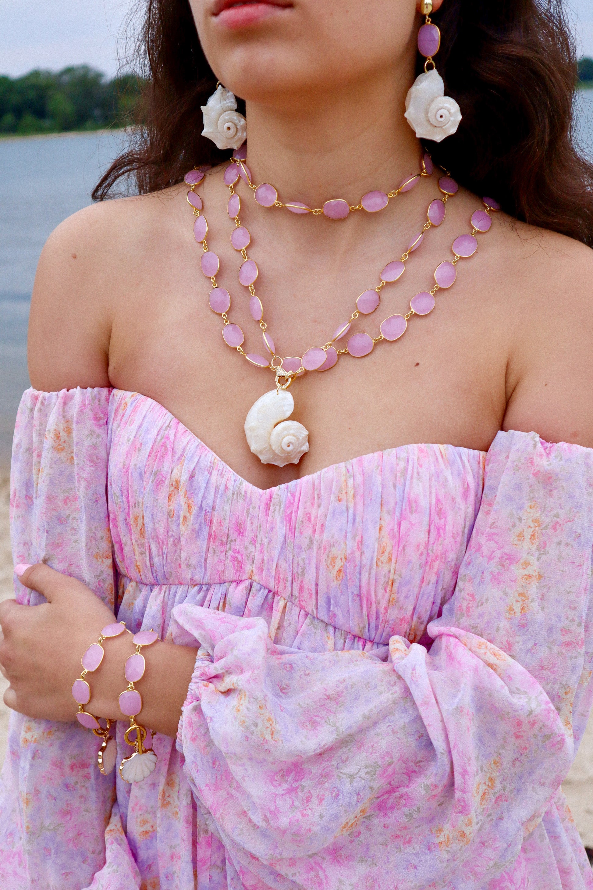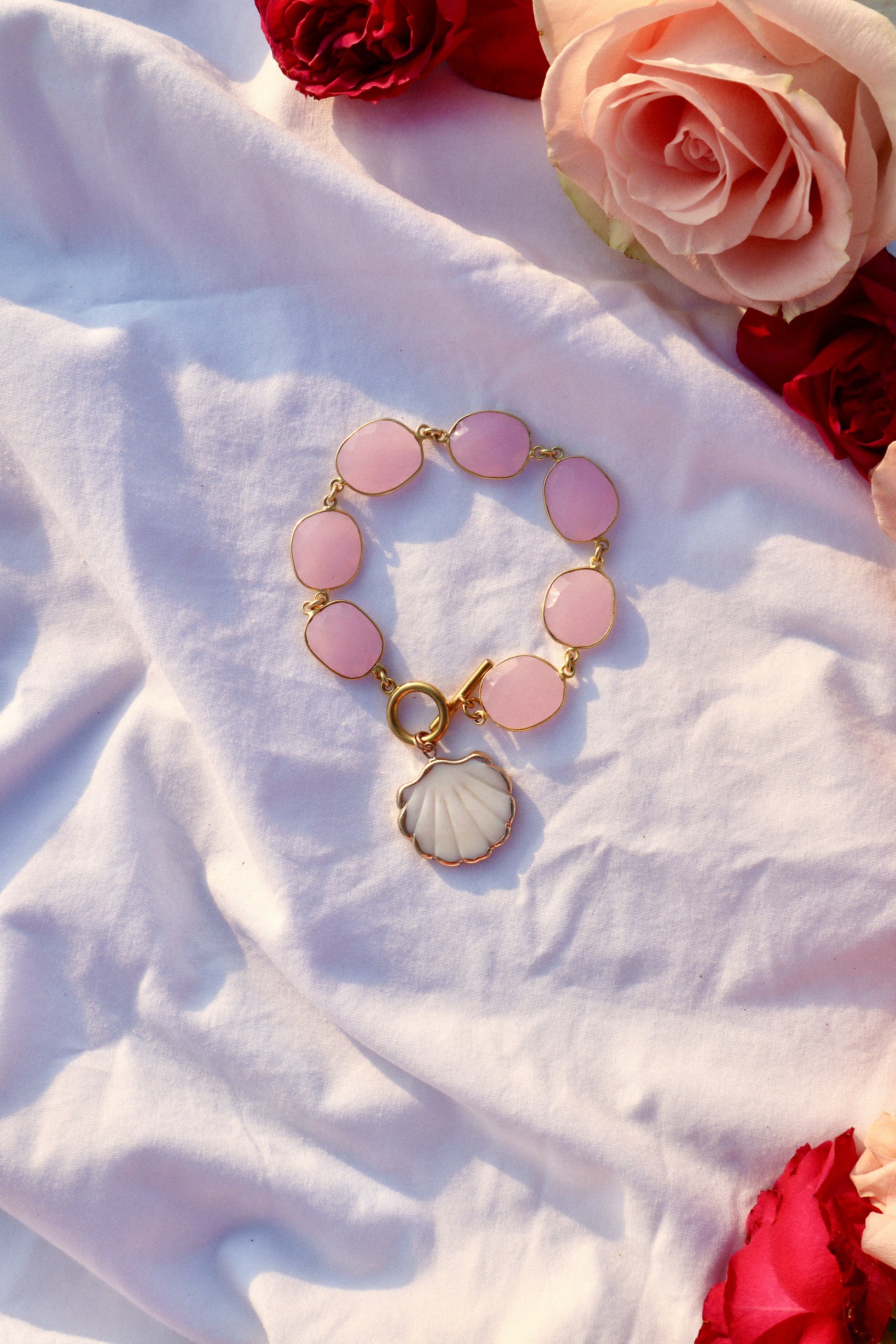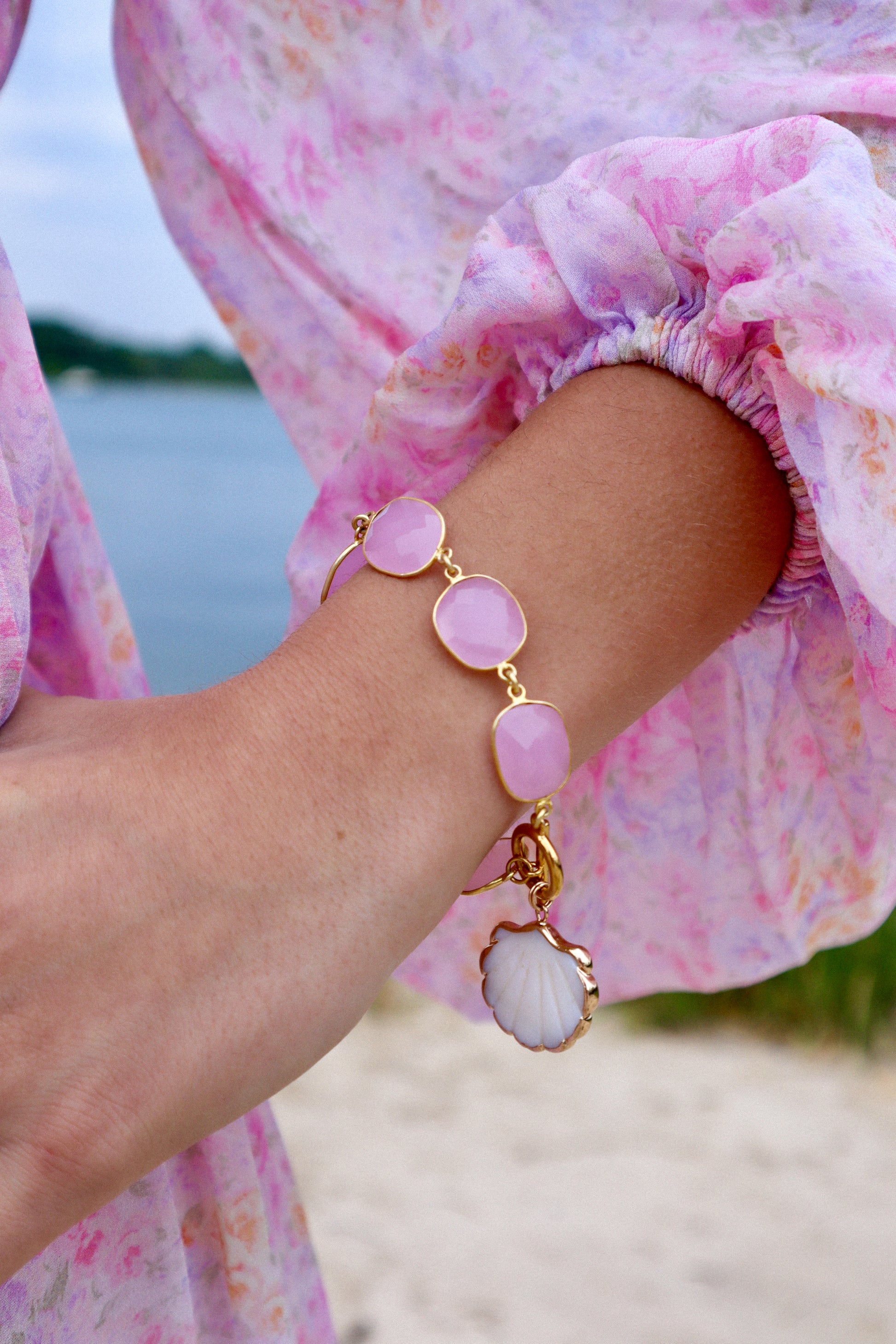 Like a gentle blush dancing across a summer sunset, this ethereal bracelet drapes your wrist in soft rosy hues.