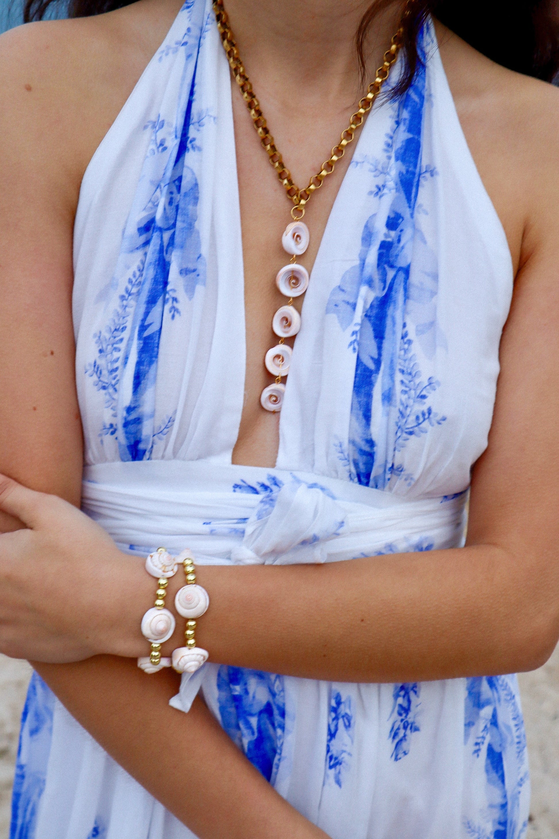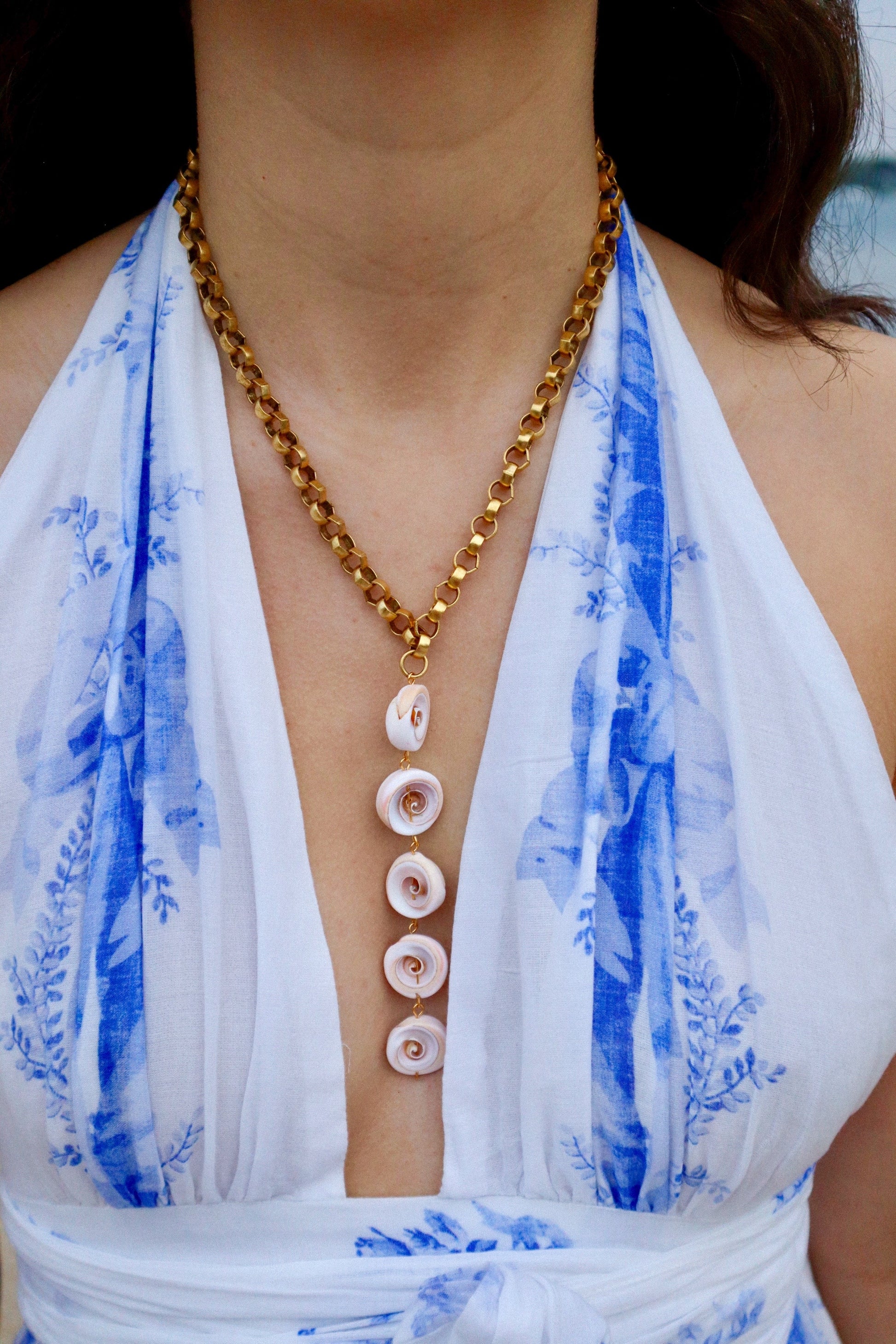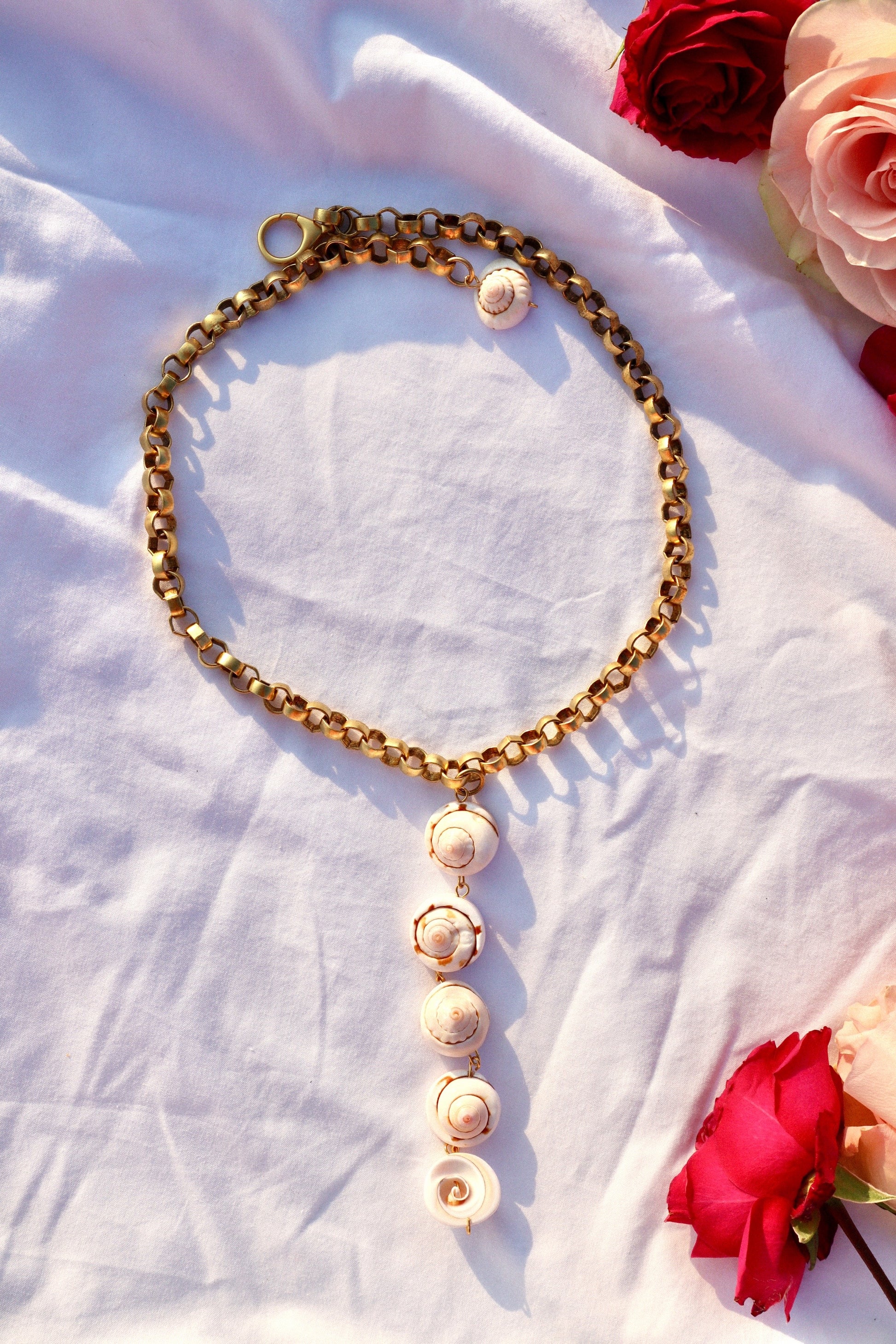 This dreamy necklace captures the magic of the shore. Strung with natural shell beads on an antique gold plated chain.