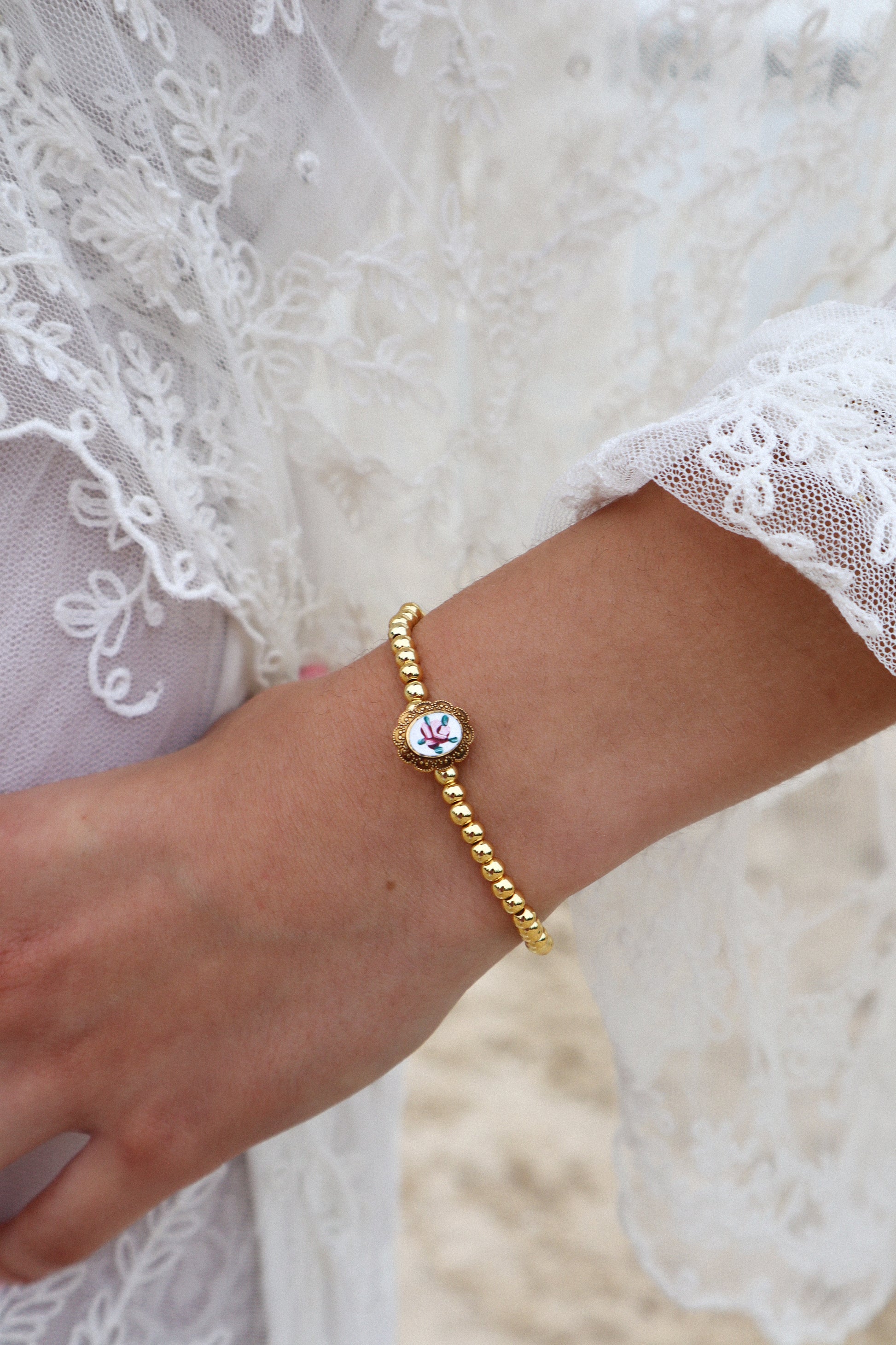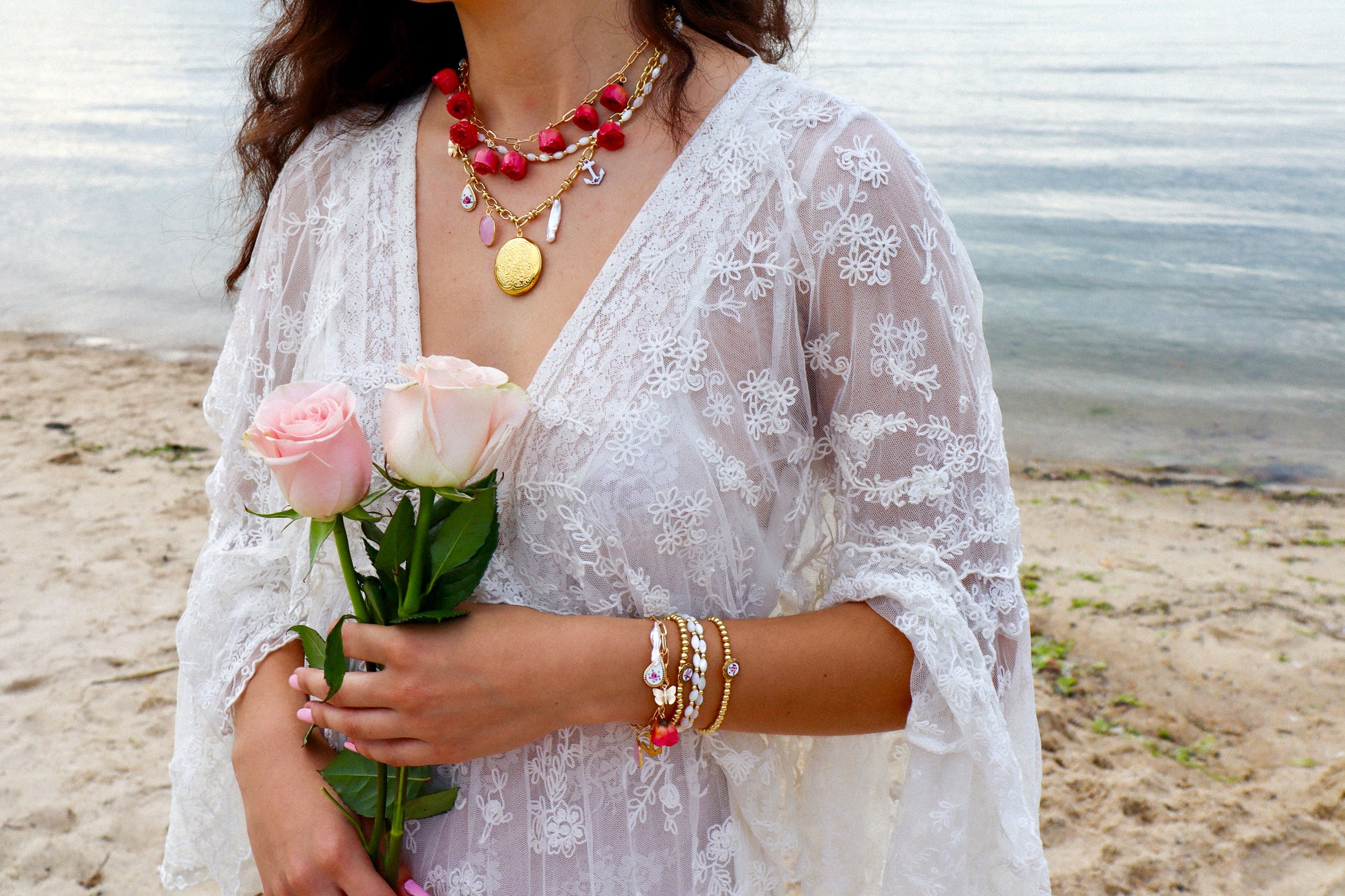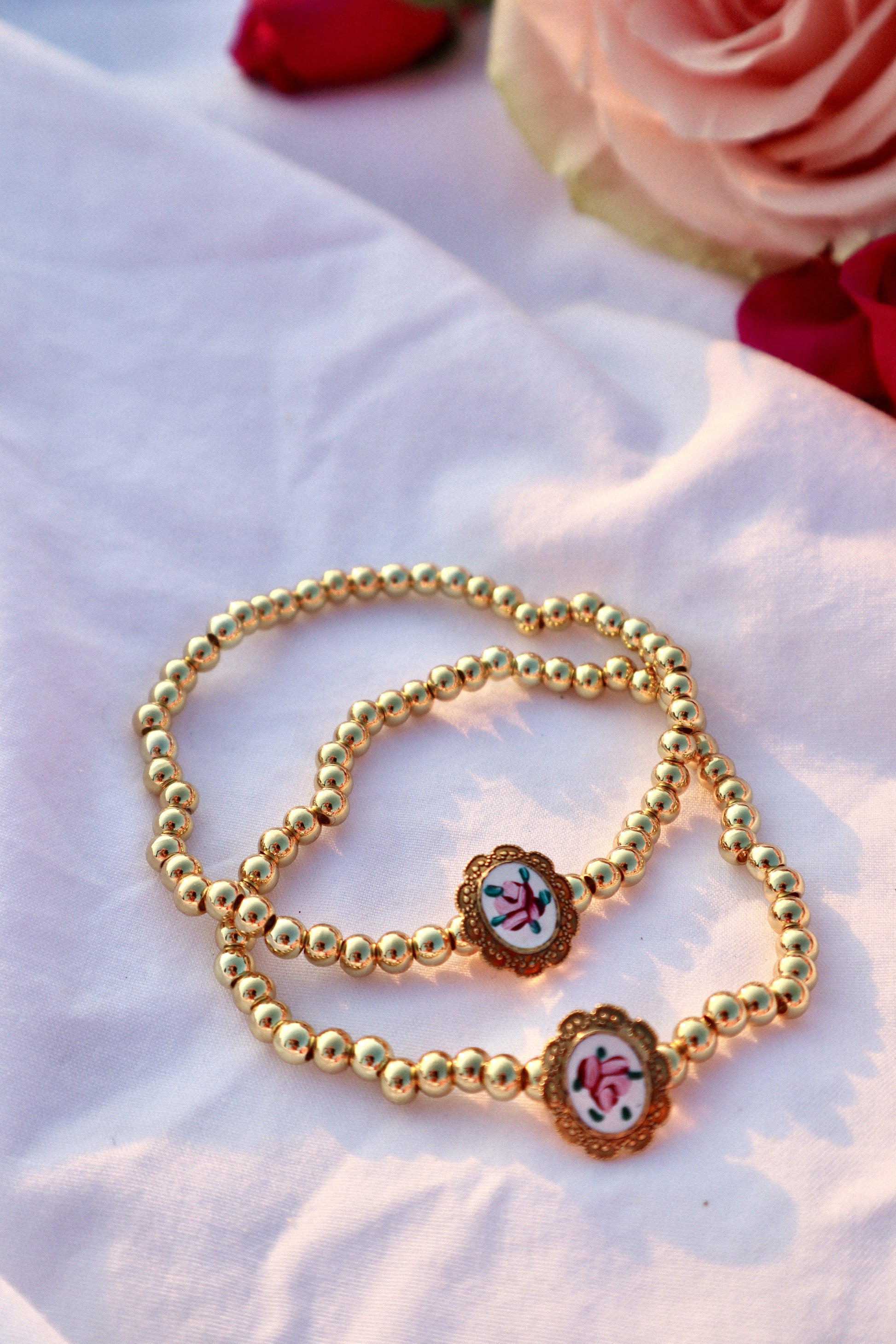 A nostalgic garden of soft pink roses blooms around your wrist.