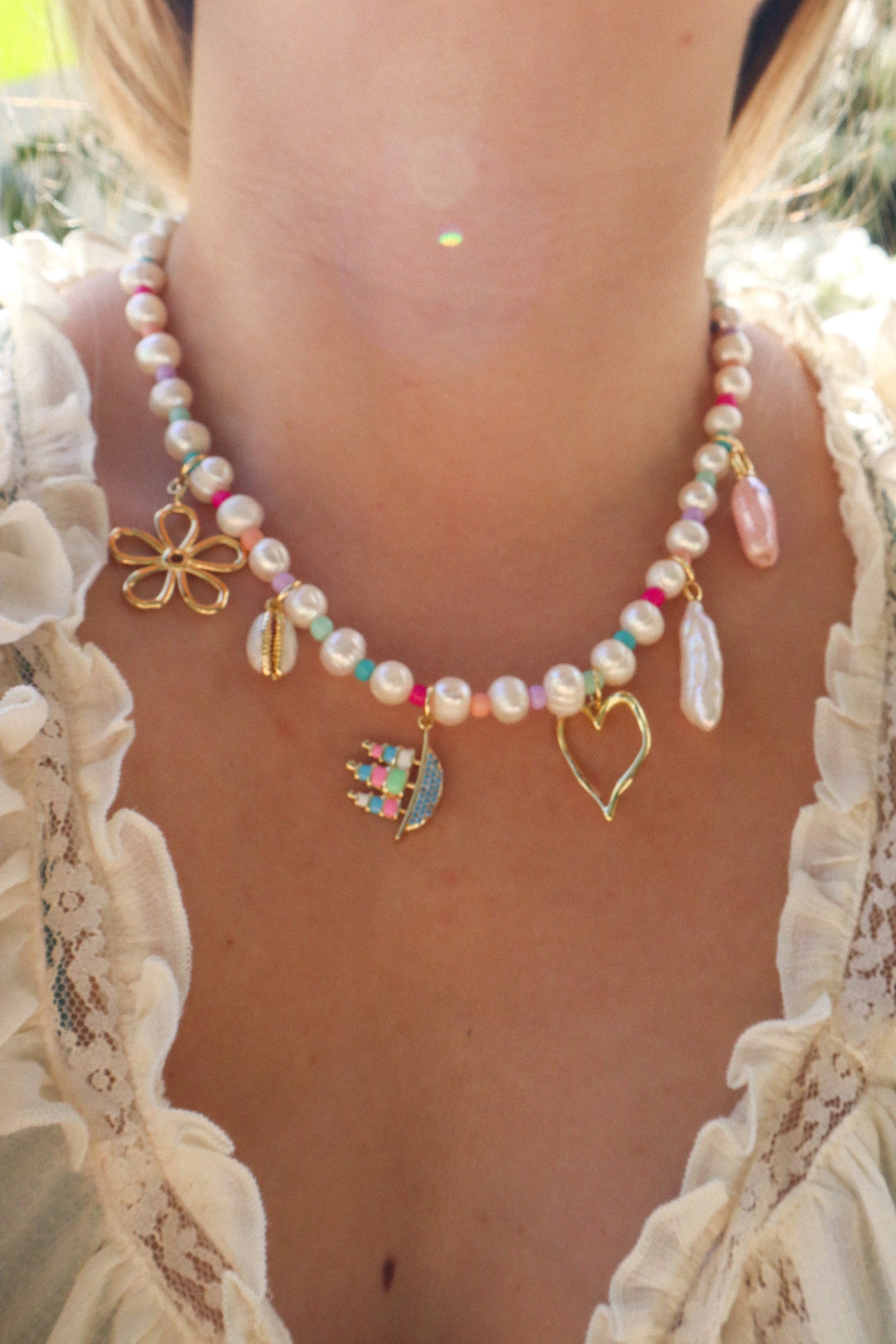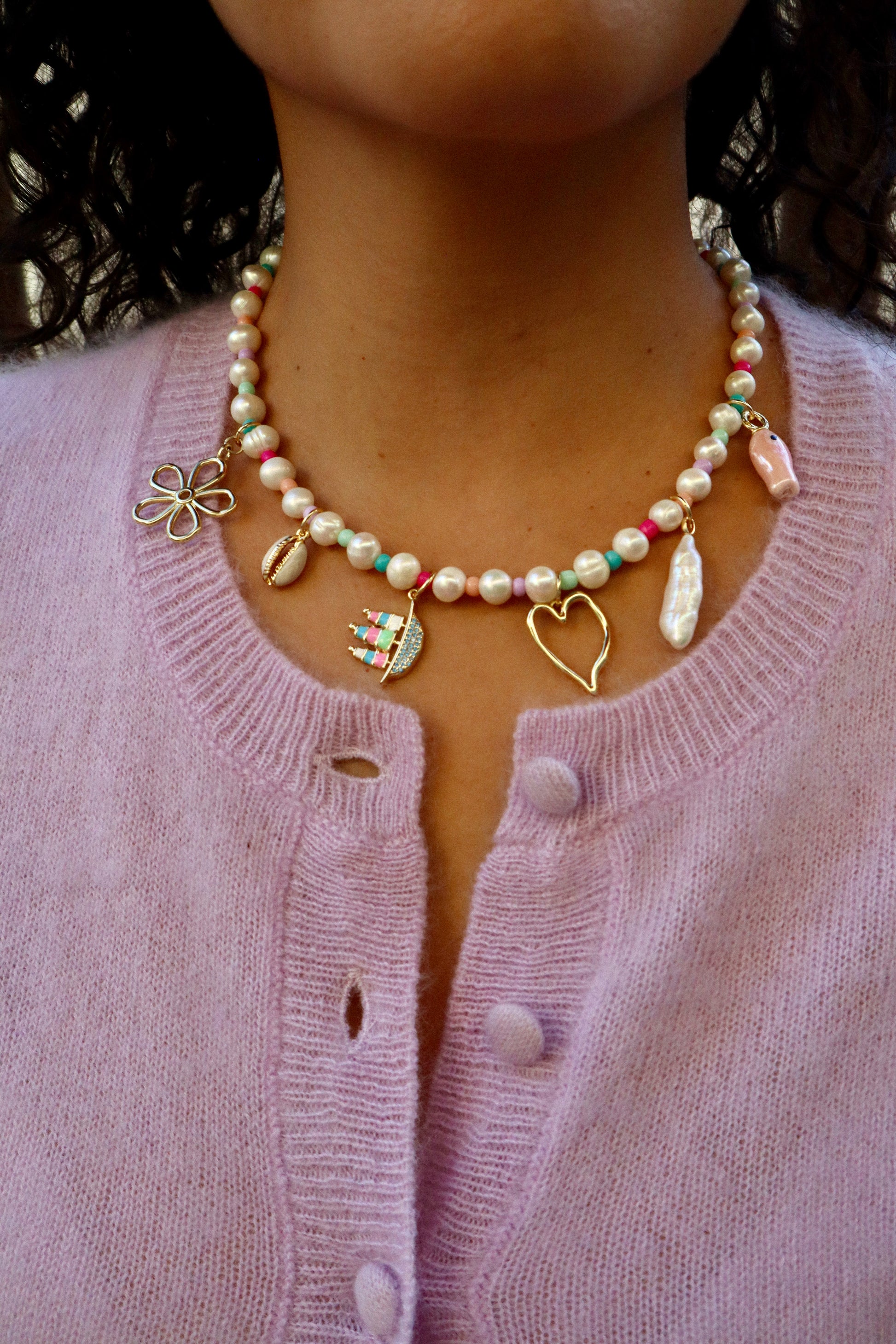 A splash of whimsy, a dash of seaside magic—The Whimsical Waters Charm Necklace is a playful escape to a world of charm and color. Strung with natural pearls and bright spacer beads.
